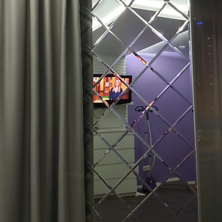 Использована серебристая квадратная зеркальная плитка размером 18х18.